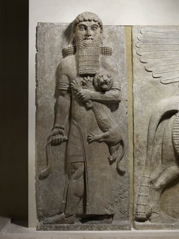the sculpture depicts a figure choking a lion. The spirit or hero overpowering the lion is in a frontal position, which is rare in Assyrian art and used only for creatures playing a magical role. In his right hand he holds a ceremonial weapon with a curved blade, known as a "harpe," which is a royal weapon.