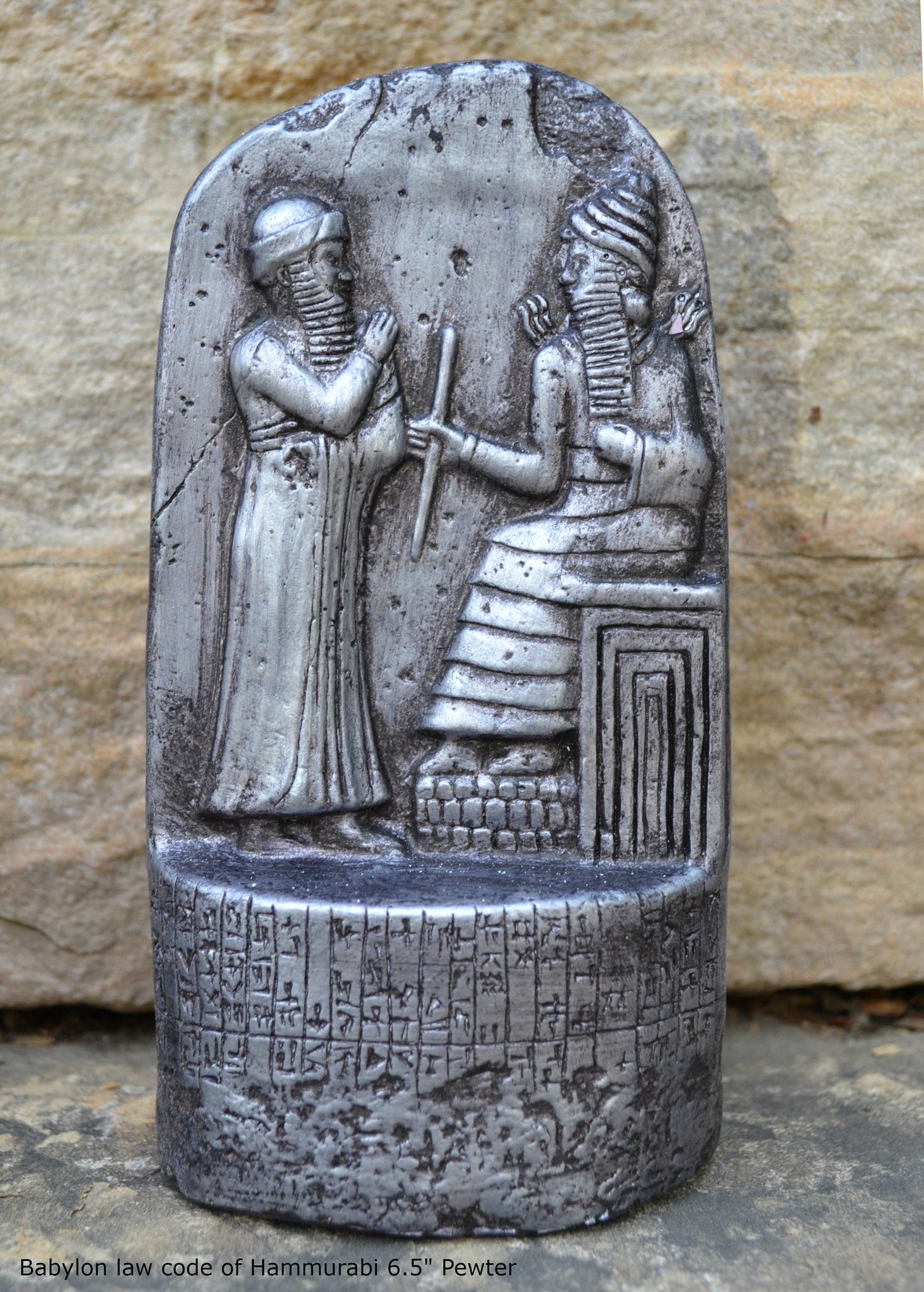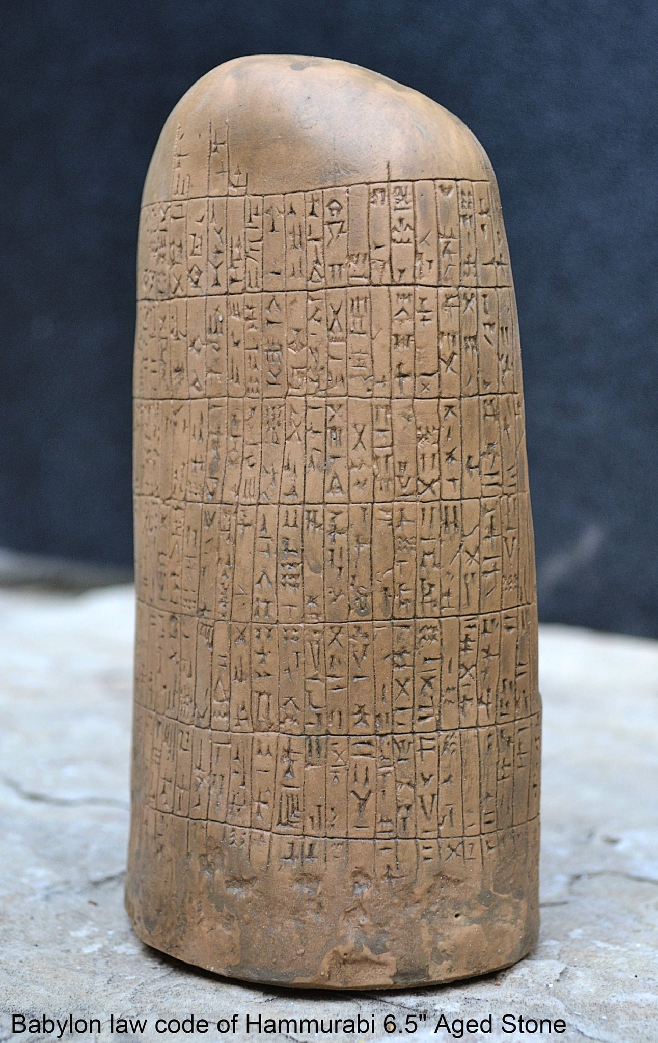 This is a replica portion of the great ancient Babylonian Code of Hammurabi. It is made to be as close to the original as possible, even showing missing pieces and a crack on the front that does not extend to the back.