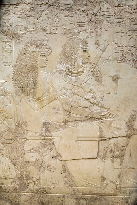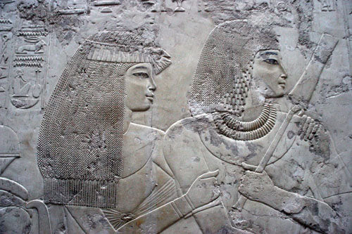 A carved relief from the tomb of Ramose showing the tomb owner with his wife. Ramose was an important official (a vizier) during the reign of Amenhotep III. Note the braided hairstyles.
