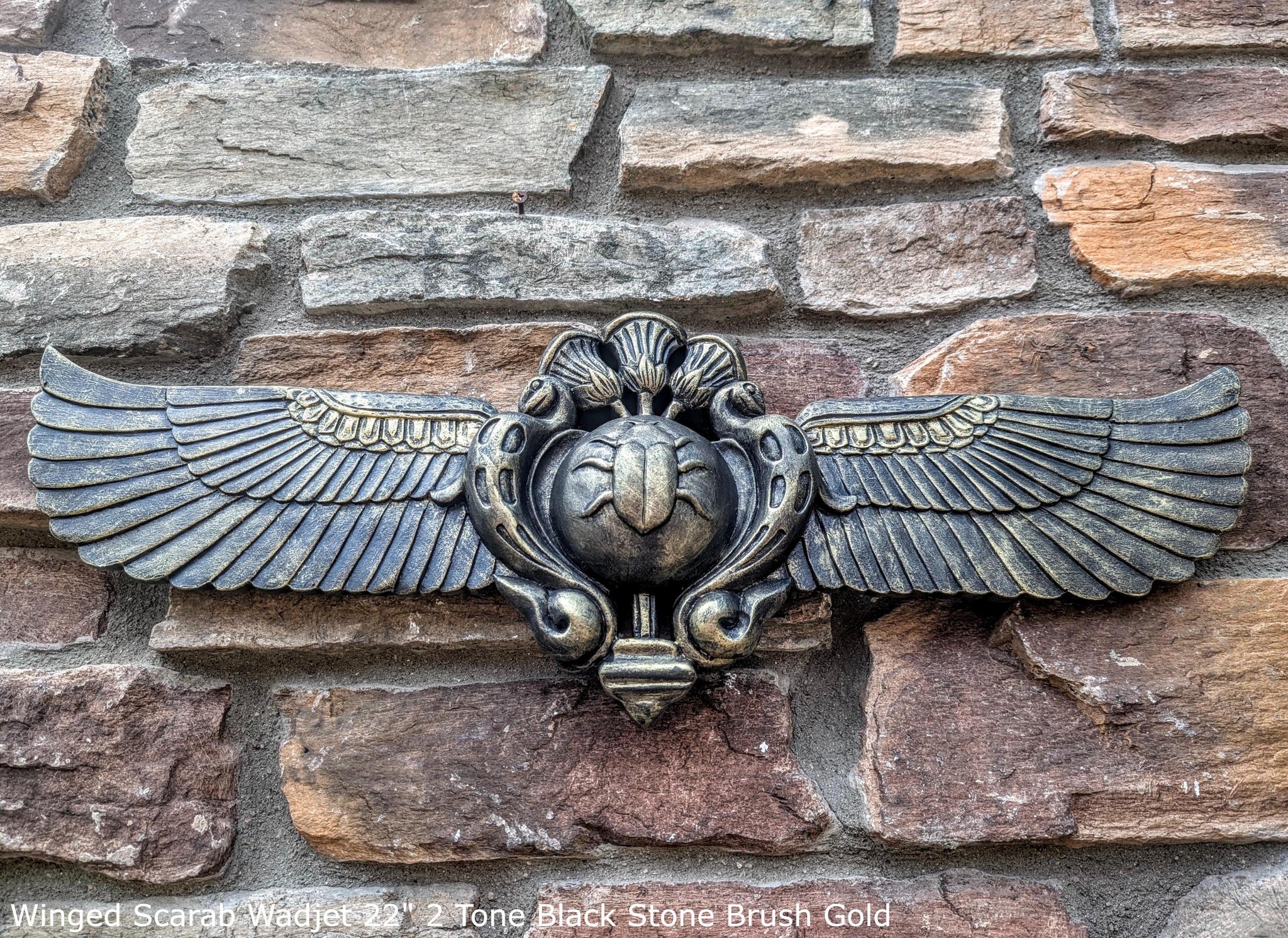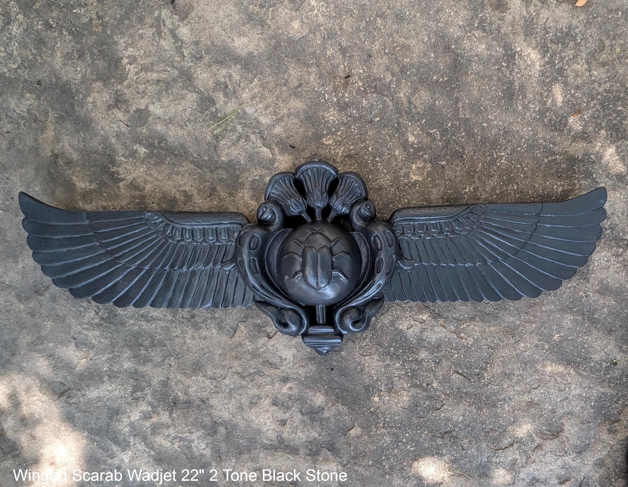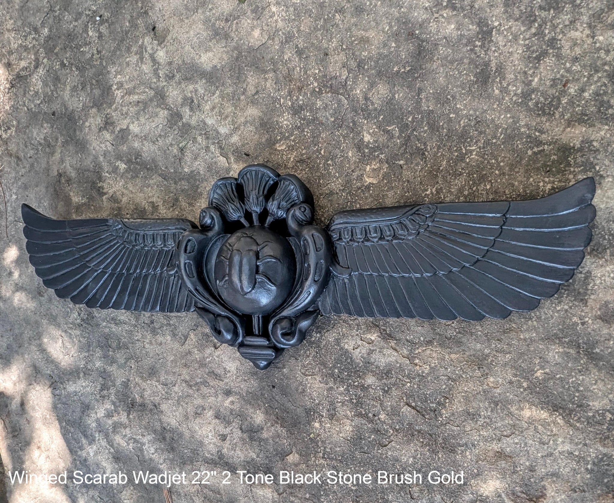 Egyptian winged Scarab Wadjet Pediment hieroglyph Sculptural wall relief www.Neo-Mfg.com 22"